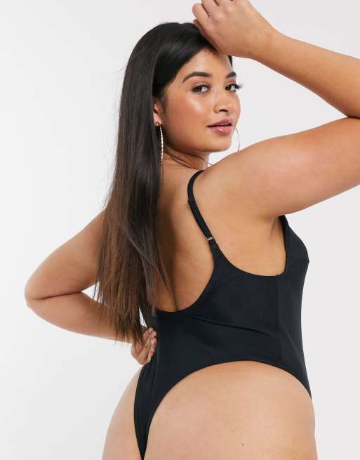 Asos Design Curve Recycled V Plunge Skinny Strap Thong Swimsuit In